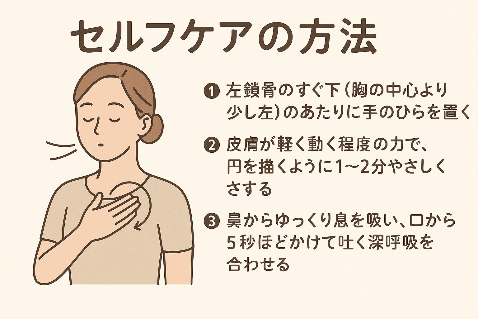 - 左鎖骨のすぐ下(胸の中心より少し左)のあたりに手のひらを置く