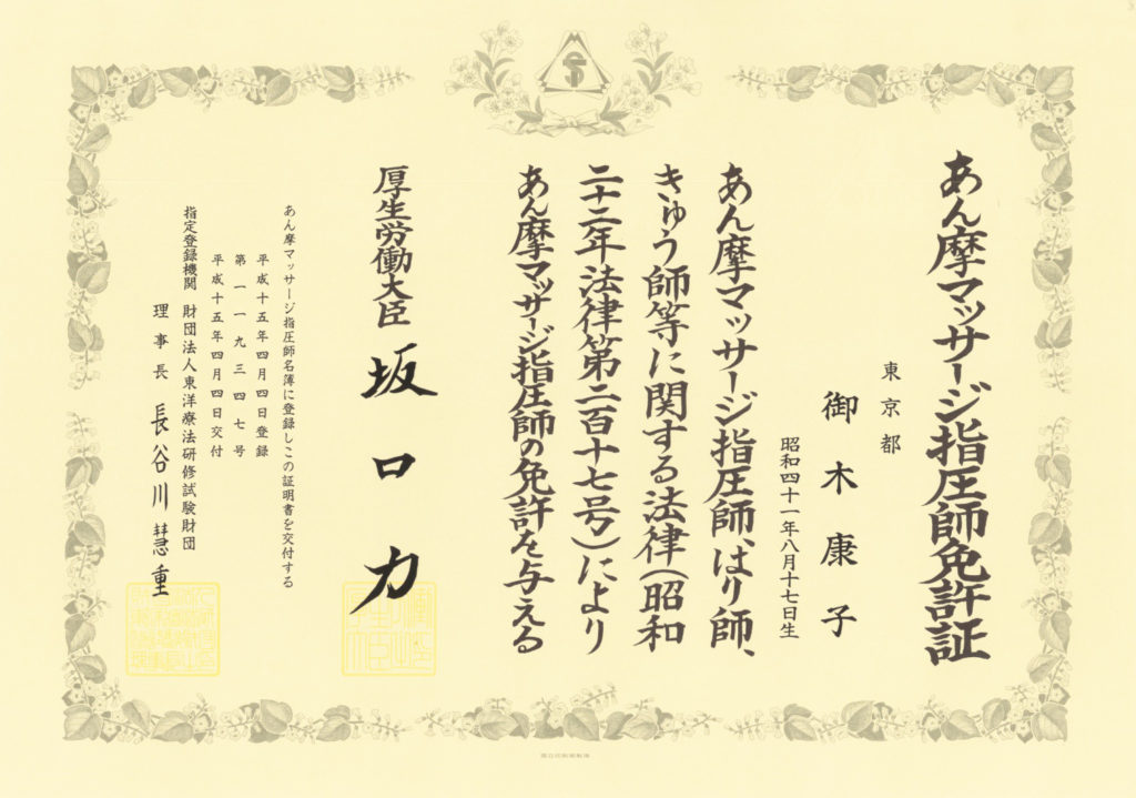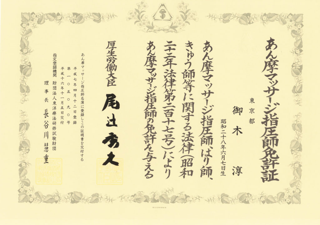 - 資格:あん摩・指圧・マッサージ師 免許登録番号105090号